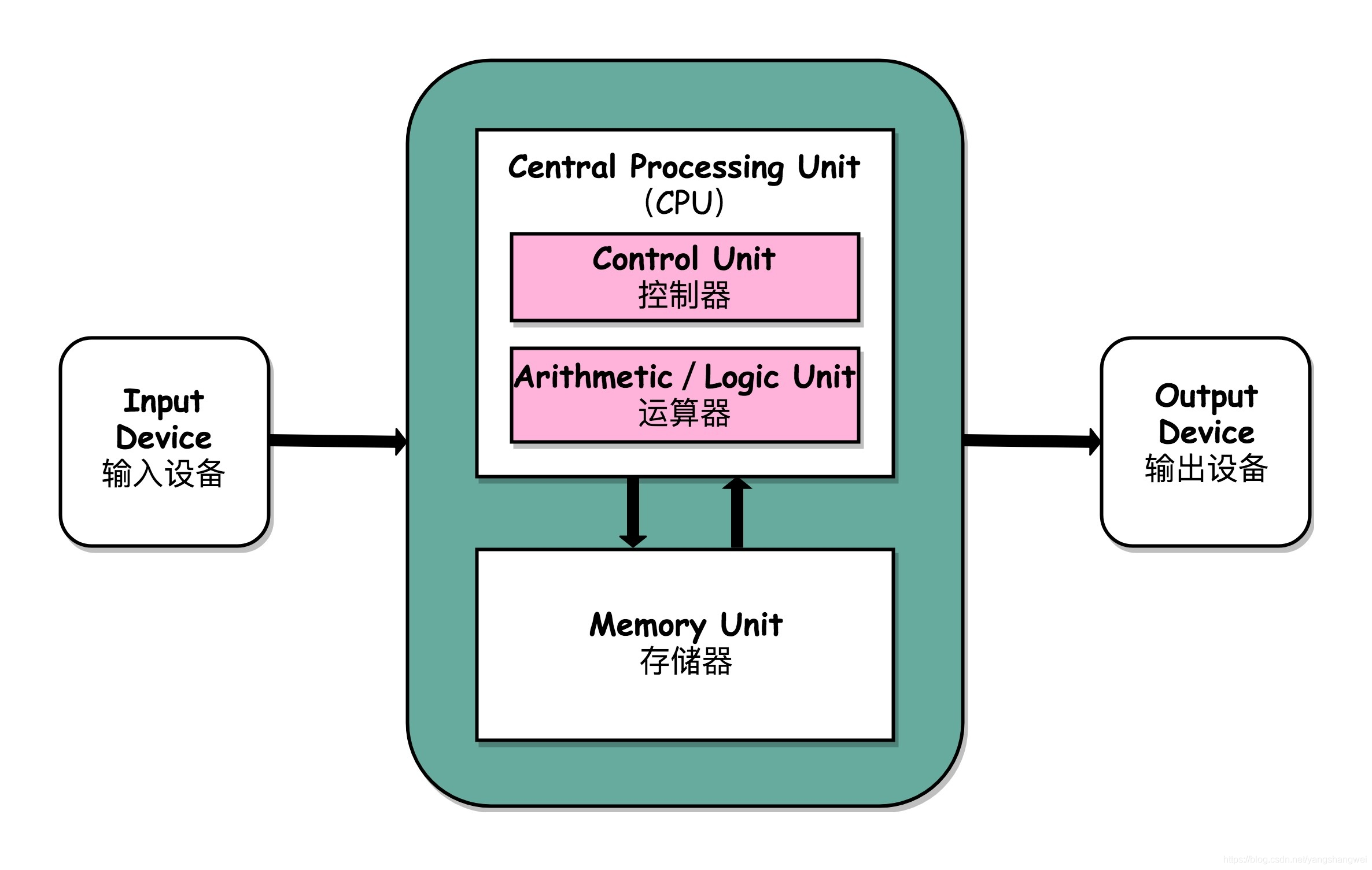 而所有的计算机程序,也都可以抽象为从 输入设备读取输入信息,通过 运算器和 控制器来执行存储在 存储器里的程序,最终把结果输出到 输出设备中。而我们所有撰写的无论高级还是低级语言的程序,也都是基于这样一个抽象框架来进行运作的。