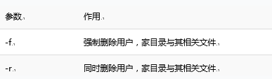 userdel命令用于删除用户所有表格,格式为:“userdel [选项] 用户名”。