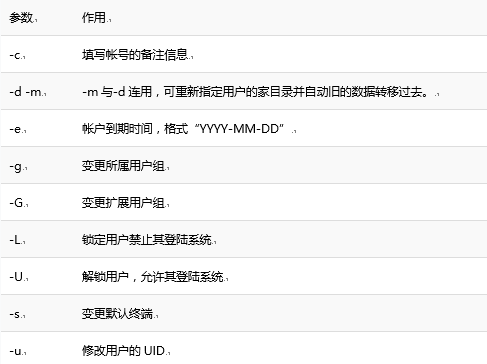 usermod命令用于修改用户的属性,格式为“usermod [选项] 用户名”。