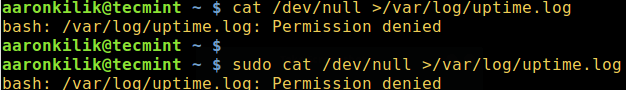在这里,我想清空一个大文件的内容,其文件名为 uptime.log,但是即便我是使用 sudo 命令也执行失败了。