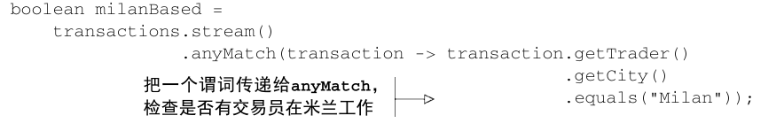 boolean liveInMilan2 = transactions.stream().map(Transaction::getTrader).anyMatch(t -> t.getCity().equals("Milan"));