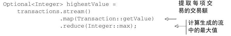 Optional<Integer> maxValue = transactions.stream().map(Transaction::getValue).reduce((i, j) -> i > j ? i : j);
