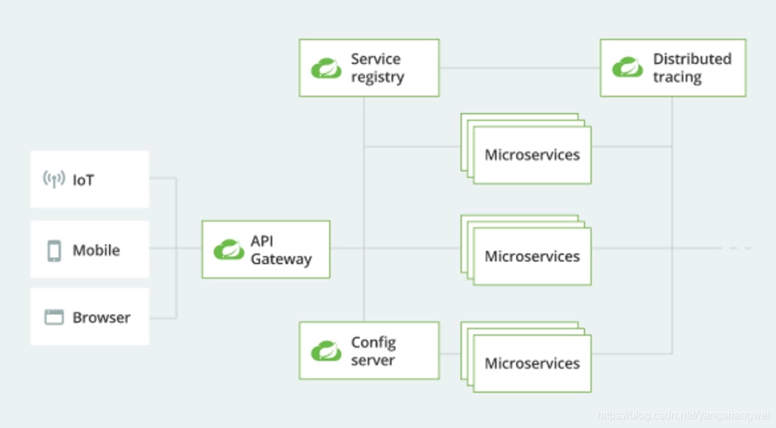 Spring Cloud 构建在 Spring Boot 基础之上,它的整体架构图如下所示: