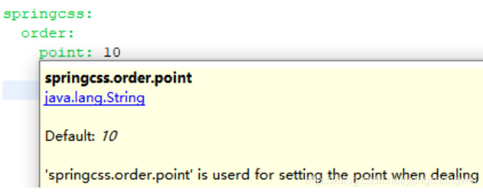 另外,假设我们需要为 springcss.order.point 配置项指定一个默认值,可以通过在元数据中添加一个"defaultValue"项来实现,如下所示: