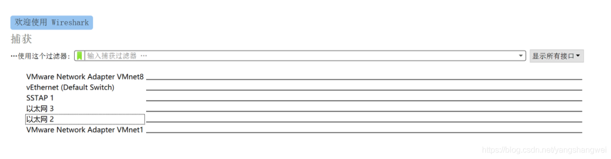 Whireshark 可以帮你看到整个网络交通情况,也可以帮你深入了解每个封包。而且 Whireshark 在 macOS、Linux、Windows 上的操作都是一致的,打开 Wireshark 会先看到如下图所示的一个选择网络接口的界面。