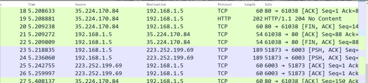 Info 是根据不同协议显示的数据,比如你可以看到在TCP 协议上看到Seq 和 ACK。这里的 Seq 和 ACK 已经简化过了,正常情况下是一个大随机数,Whireshark 帮你共同减去了一个初始值。
