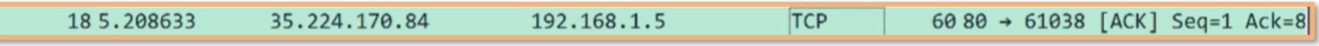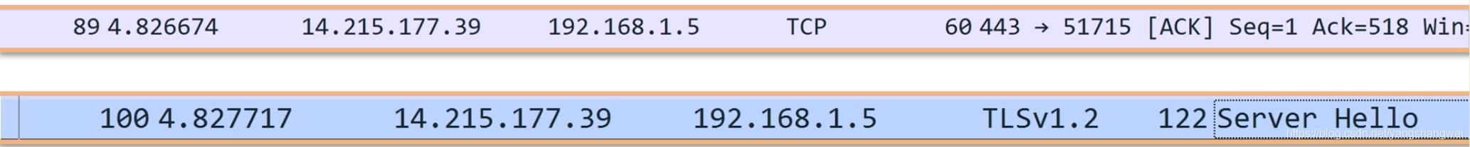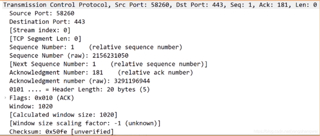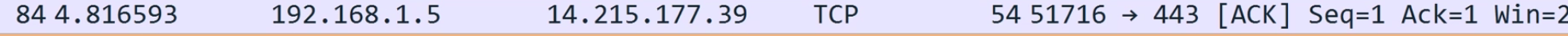 你可以看到这次捕获是一次 ACK(见 Flags)字段,从端口 58260 发往 443,那么大概率是 HTTPS 客户端给服务器的响应。