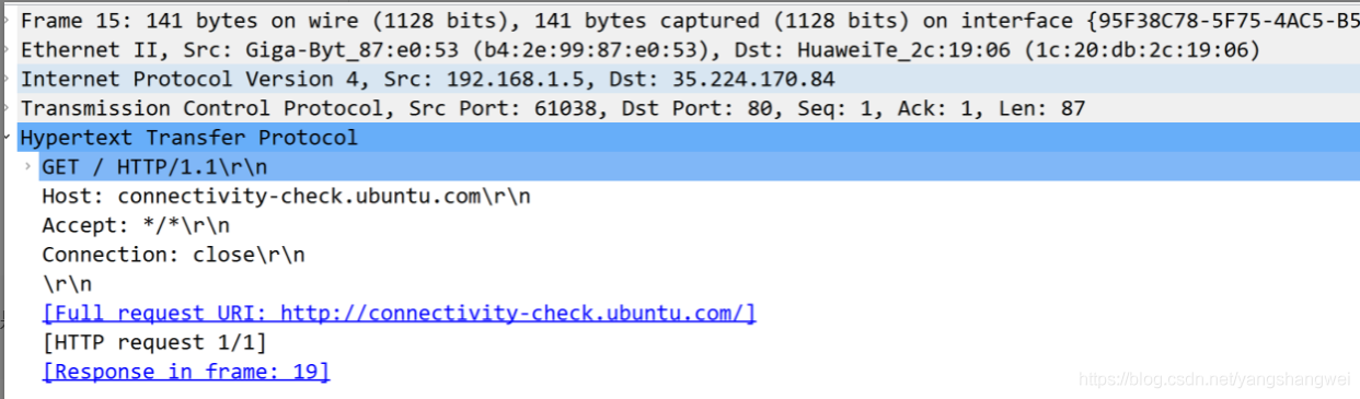 可以看到,Wireshark 不仅仅捕获了应用层,还可以看到这次 HTTP 捕获对应的传输层、网络层和链路层数据。