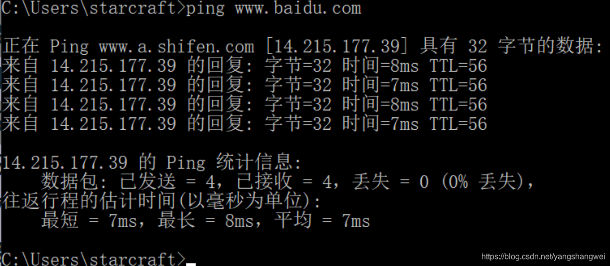 比如我们想分析一次到百度的握手。首先开启捕获,然后在浏览器输入百度的网址,最后通过ping指令看下百度的 IP 地址,如下图所示: