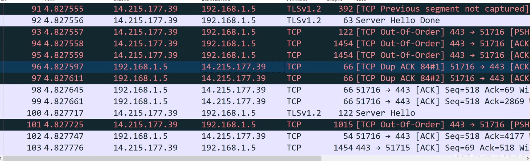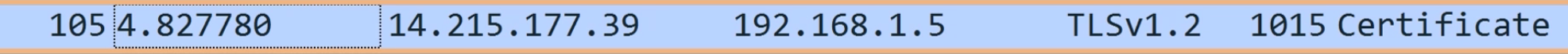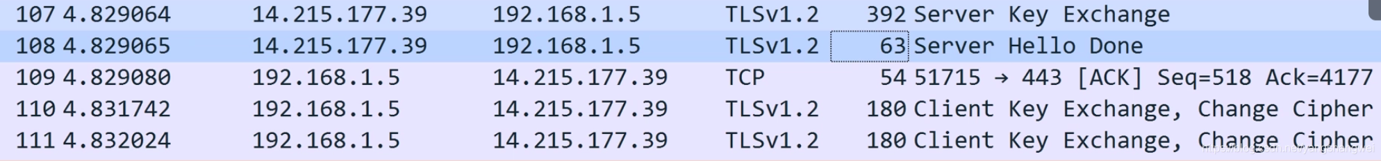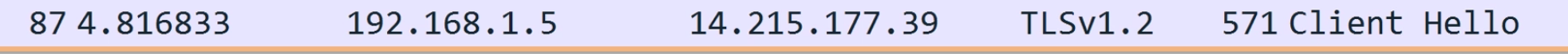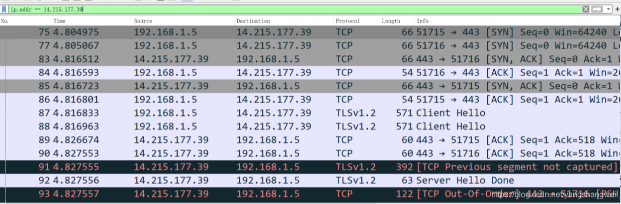 这样看到的就是和百度关联的所有连接。上图中刚好是一次从建立 TCP 连接(3 次握手),到 HTTPS 协议传输握手的完整过程。你可以只看从192.168.1.5到14.215.177.39的请求。