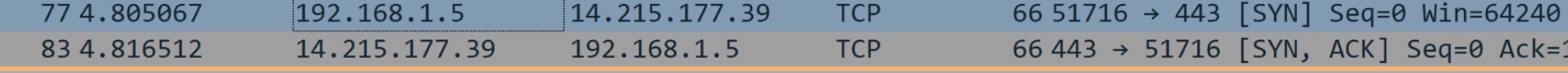 首先是从客户端(192.168.1.5)发出的 SYN 和百度返回的 SYN-ACK,如下图所示: