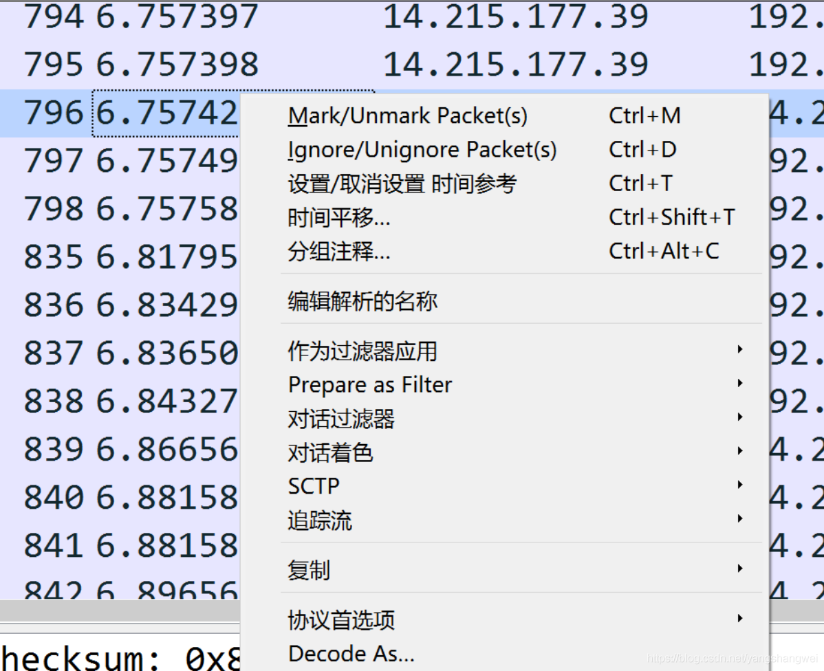 Wireshark 是个强大的工具,支持大量的协议。还有很多关于 Wireshark 的能力,希望你可以进一步探索,如下图中鼠标右键一次捕获,可以看到很多选项,都是可以深挖的。