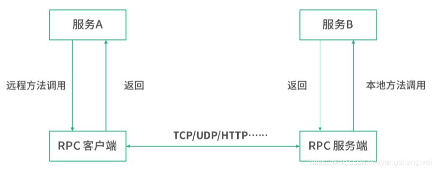 服务 A 发起远程方法调用,RPC 客户端通过某种协议将请求发送给服务 B,服务 B 解析请求,进行本地方法的调用,将结果返回到服务 B 的 RPC 服务端,最终返回到服务 A。