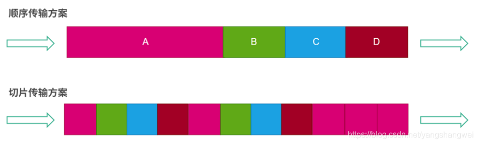 上图中,我们用不同颜色代表不同的传输任务。采用顺序传输方案将 A、B、C、D 用一个连接传输节省了握手、挥手的成本。切片传输的方案在这之上,将数据切片可以保证大、小任务并行,不会因为大任务阻塞小任务。