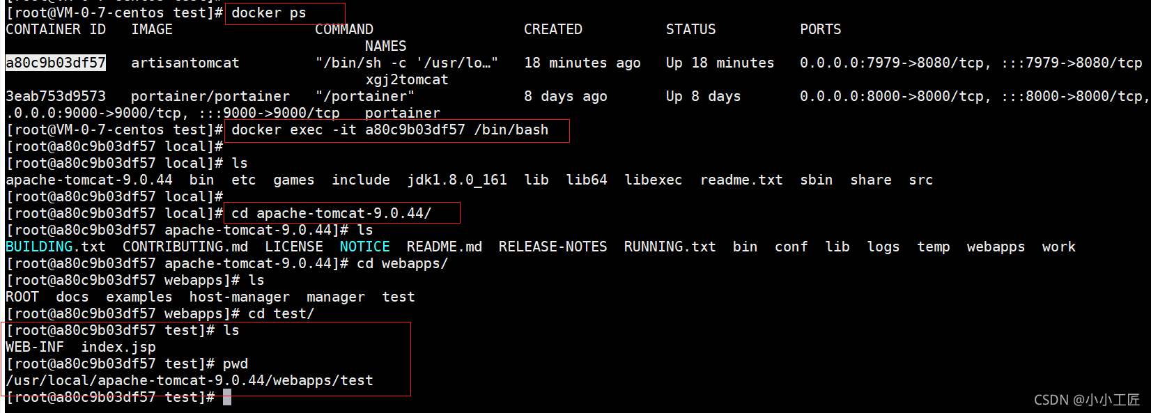 [root@VM-0-7-centos jdk]# docker run -d -p 7979:8080 --name xgjtomcat -v /root/tomcat/test:/usr/local/apache-tomcat-9.0.44/webapps/test -v /root/tomcat/tomcatlogs/:/usr/local/apache-tomcat-9.0.44/logs artisantomcat