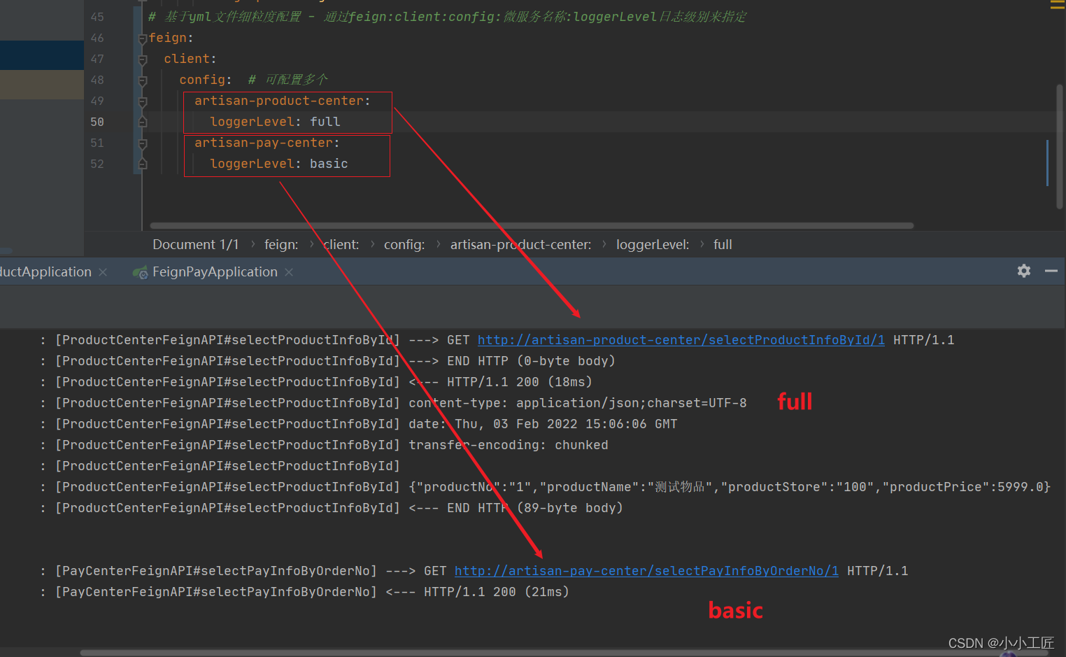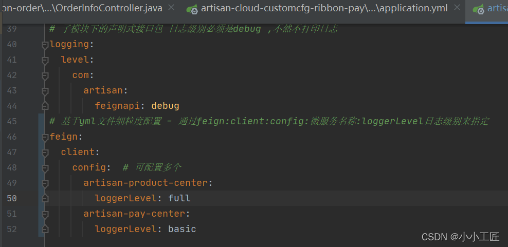 在调用方artisan-cloud-feign-order ,通过feign:client:config:微服务名称:loggerLevel: 日志级别来指定