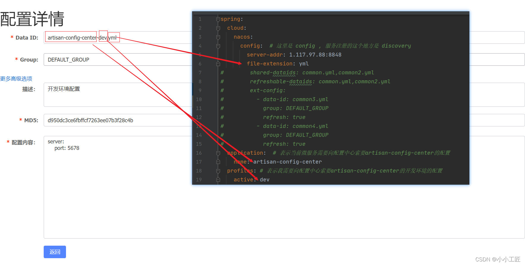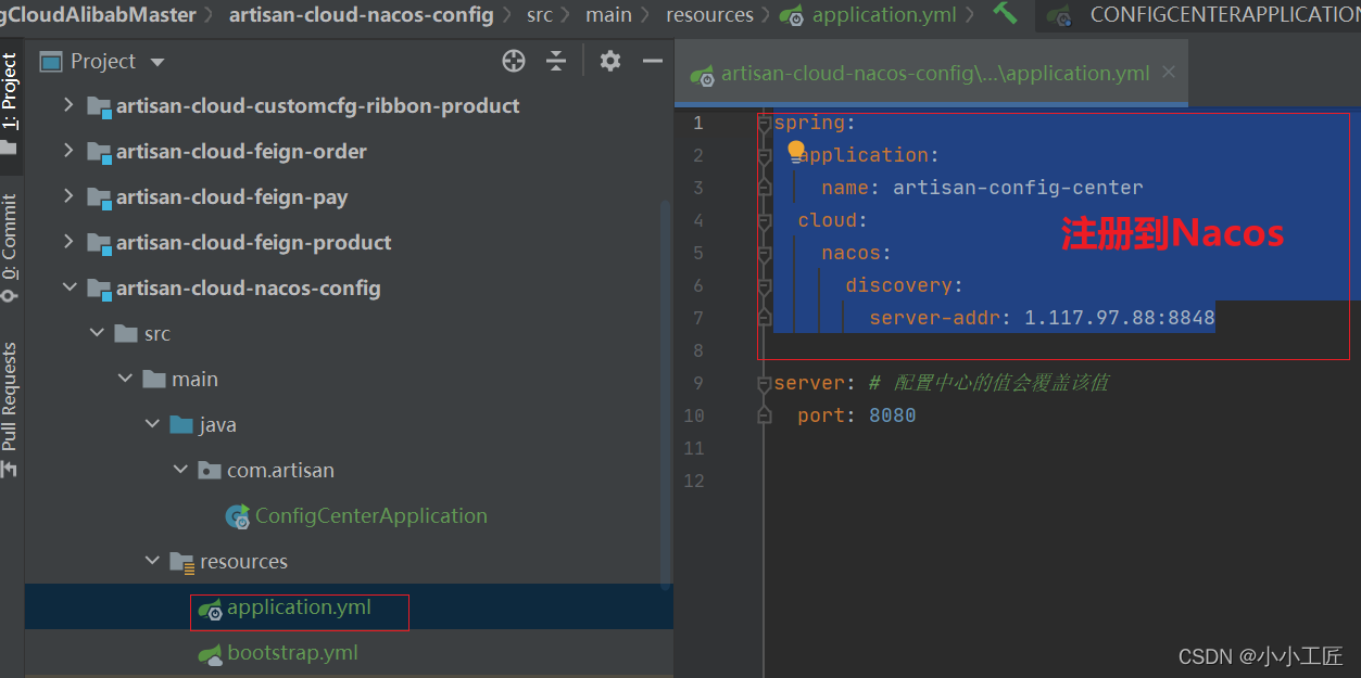 server-addr: 1.117.97.88:8848表示我微服务怎么去找我的配置中心spring.application.name=artisan-config-center表示当前微服务需要向配置中心索要artisan-config-center的配置spring.profiles.active=dev表示我需要向配置中心索要artisan-config-center的dev环境的配置