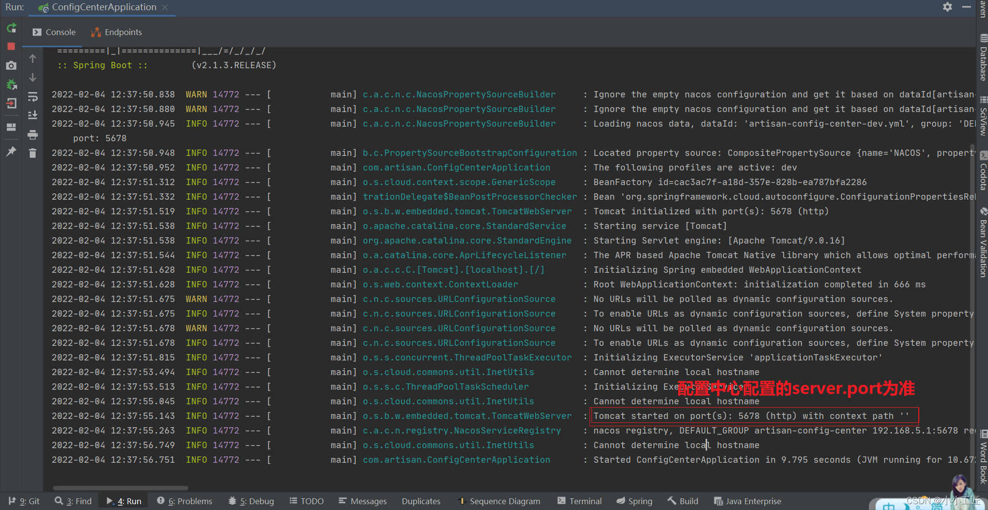 2022-02-04 13:30:27.453 INFO 21040 --- [ main] c.a.c.n.c.NacosPropertySourceBuilder : Loading nacos data, dataId: 'artisan-config-center-dev.yml', group: 'DEFAULT_GROUP', data: server: