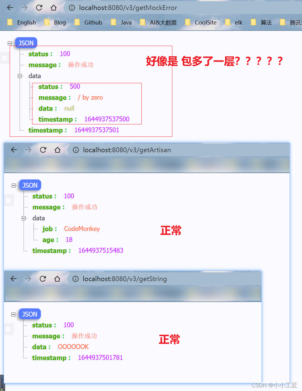 看到问题了吧,当我们同时启用统一标准格式封装功能ResponseAdvice和RestExceptionHandler全局异常处理器时,统一格式增强功能会给返回的异常结果再次封装,所以跟前端的接口响应又迷糊了