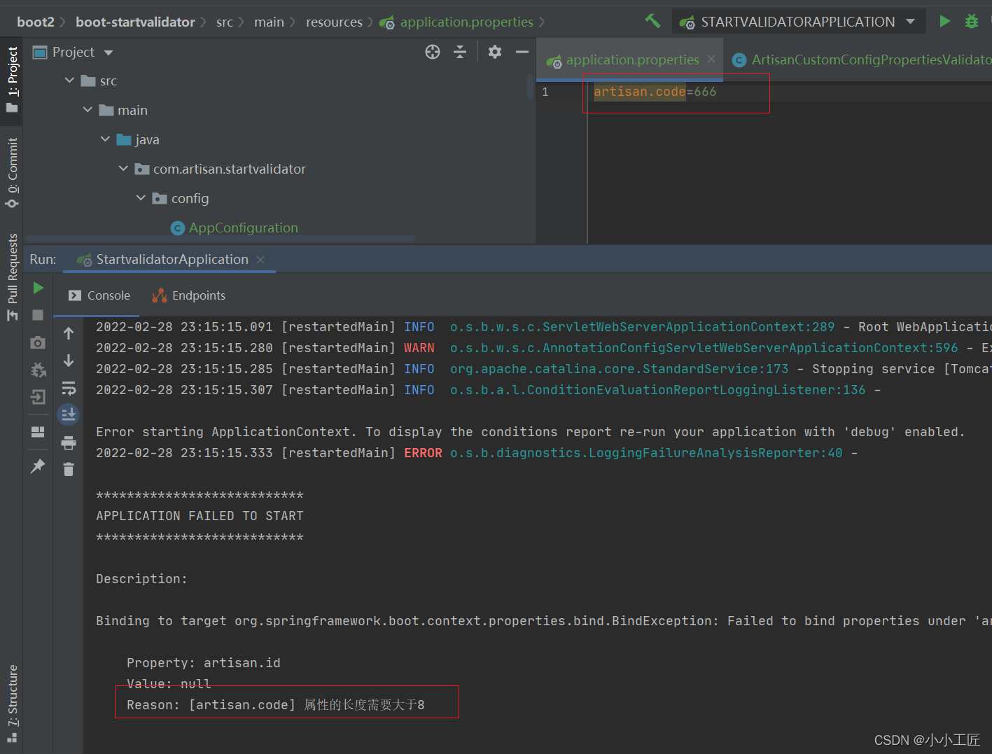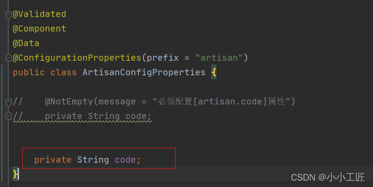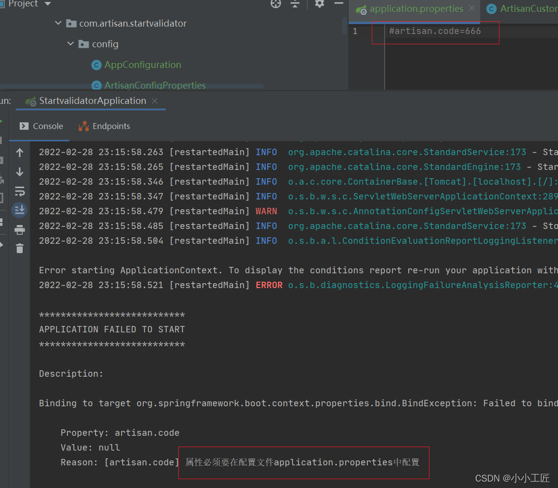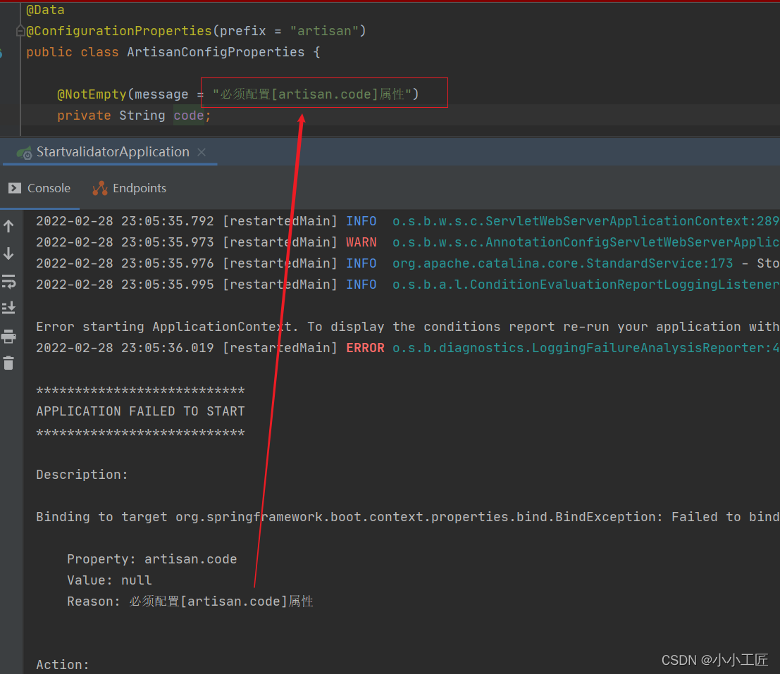 上面的配置就会校验在application配置文件中有没有配置artisan.code 。若没有配置,项目启动就会失败,并抛出校验异常。