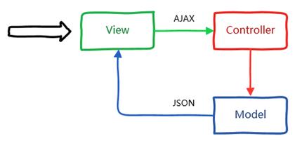 为了使数据展现过程更加直接,并且提供更好的用户体验,我们有必要对MVC模式进行改进。不妨这样来尝试:首先从浏览器发送AJAX请求,然后服务端接受该请求并返回JSON数据返回给浏览器,最后在浏览器中进行界面渲染。改进后的MVC模式如下图所示: