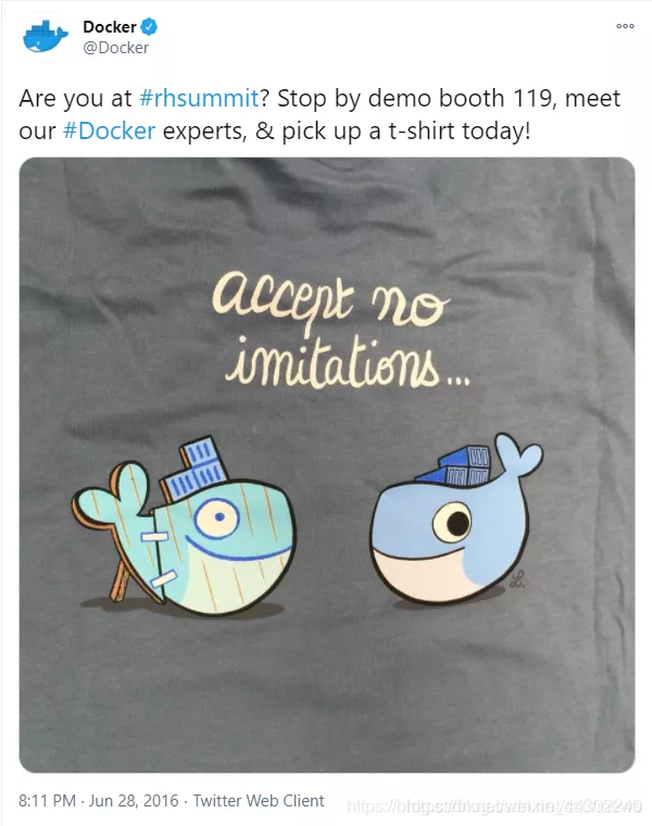 在 2015 年的峰会上,红帽发布了 OpenShift V3.0,该新版本 OpenShift 底层采用 Docker 容器,同时开始使用 Kubernetes 来编排镜像。然而,在 2016 年的红帽峰会期间,Docker 对红帽的 OpenShift 展开了锋芒毕露的攻击。他们不仅发表了以下推文,还给与会者发放带有“我们不接受模仿”字样的T恤衫: