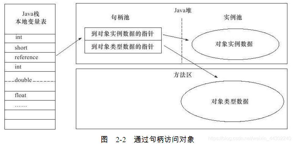建立对象是为了使用对象,我们的Java程序需要通过栈上的reference数据来操作堆上的具体对象。由于reference类型在Java虚拟机规范中只规定了一个指向对象的引用,并没有定义这个引用应该通过何种方式去定位、访问堆中的对象的具体位置,所以对象访问方式也是取决于虚拟机实现而定的。目前主流的访问方式有使用句柄和直接指针两种。如果使用句柄访问的话,那么Java堆中将会划分出一块内存来作为句柄池,reference中存储的就是对象的句柄地址,而句柄中包含了对象实例数据与类型数据各自的具体地址信息。