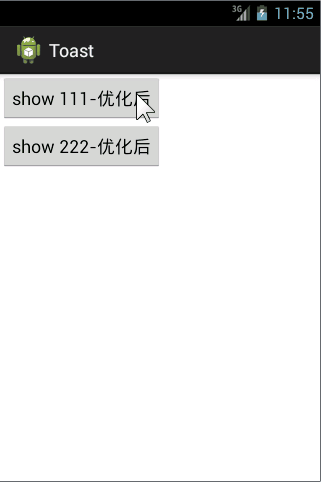 但是我们经常会遇到这样一种情况,比如说我们有两个按钮,每次点击之后就会弹出一个Toast,但是如果这两个按钮快速点击,我们看到的效果是这样的: