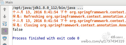 } 这里的我们直接获取两个ScopeTest类的实例,然后比较这两个是否是同一个就可以知道@Scope注解是否生效,运行结果如下:
