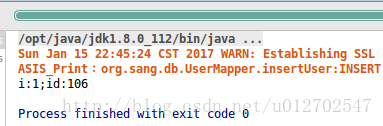 } 注意,这里的i表示受影响的行数,在这里就是插入的行数,我们在构造User对象的时候id是为null,数据插入成功之后再来打印id属性,我们来看看结果: