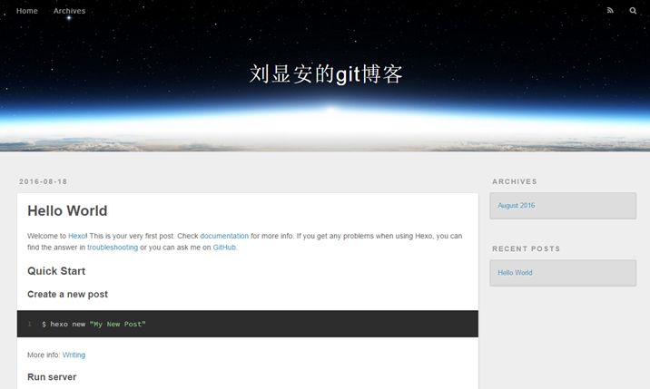 第一次初始化的时候hexo已经帮我们写了一篇名为 Hello World 的文章,默认的主题比较丑,打开时就是这个样子: