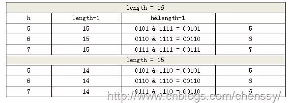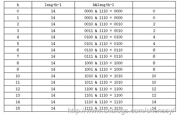 而当length = 16时,length ? 1 = 15 即1111,那么进行低位&运算时,值总是与原来hash值相同,而进行高位运算时,其值等于其低位值。所以说当length = 2^n时,不同的hash值发生碰撞的概率比较小,这样就会使得数据在table数组中分布较均匀,查询速度也较快。