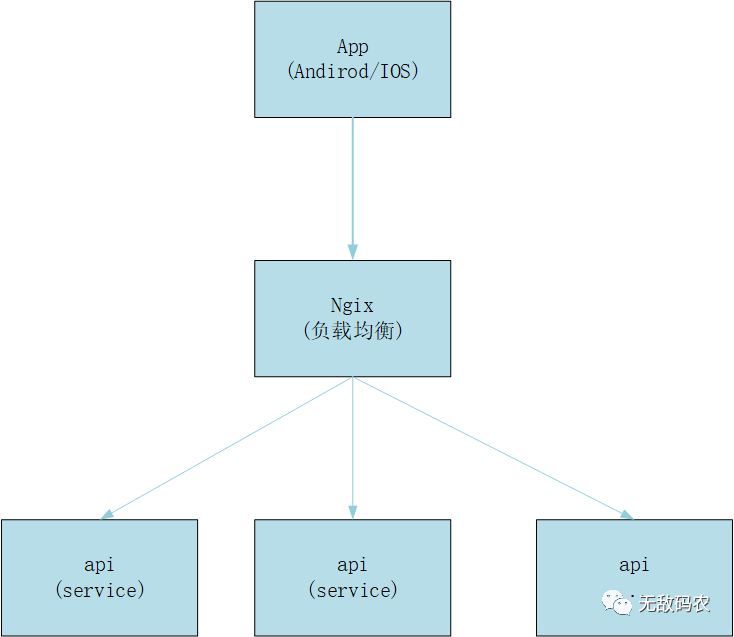 在公司业务初创时期,面对的主要问题是如何将一个想法变成实际的软件实现,在这个时候整个软件系统的架构并没有搞得那么复杂,为了快速迭代,整个软件系统就是由“App+后台服务”组成,而后台服务也只是从工程角度将应用进行Jar包的拆分。此时软件系统架构如下:
