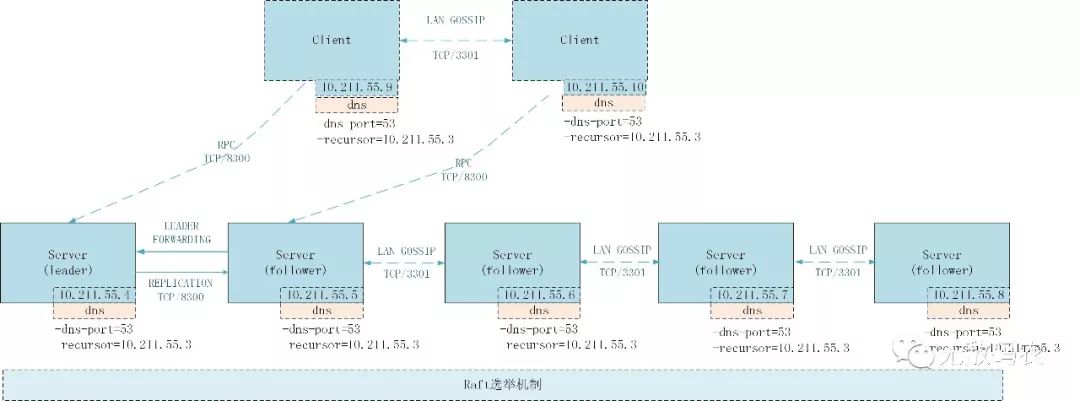 实际生产案例中并没有设置Client节点,而是通过5个Consul Server节点组成的集群,来服务整套生产集群的应用注册&发现。这里有细节需要了解下,实际上5个Consul Server节点的IP地址是不一样的,具体的服务在连接Consul集群进行服务注册与查询时应该连接Leader节点的IP,而问题是,如果Leader节点挂掉了,相应的应用服务节点,此时如何连接通过Raft选举产生的新Leader节点呢?难道手工切换IP不成?