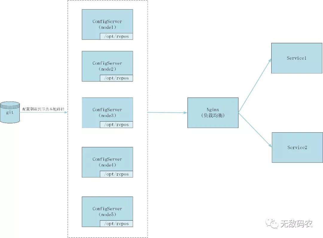 在生产实践中,因为像Consul、ConfigServer这样的关键组件,需要搭建独立的集群,并且部署在物理机而不是容器里。在上一节介绍Consul的时候,我们是独立搭建了5个Consul Server节点。而ConfigServer因为主要是http配置文件访问服务,不涉及节点选举、一致性同步这样的操作,所以还是按照传统的方式搭建高可用配置中心。具体结构示意图如下: