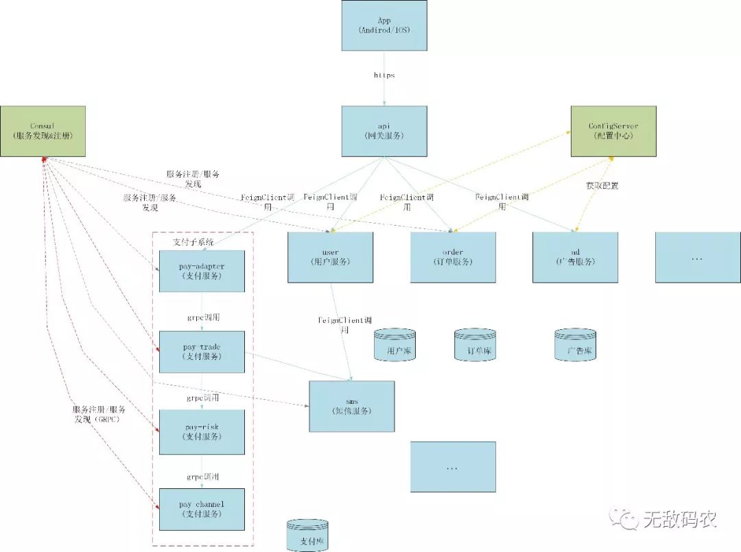 事实上,在后续的系统架构演进中,在某些服务模块进一步向子系统化拆分的过程中,就采用了grpc作为子系统服务间的调用方式。例如,支付模块的继续扩张,对支付服务本身又进行了微服务架构的拆分,此时支付微服务内部就采用了grpc的方式进行调用,而服务注册与发现本身则还是依赖于同一套Consul集群。