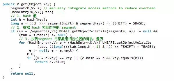 get 是不需要加锁的:原因是get方法是将共享变量(table)定义为volatile,让被修饰的变量对多个线程可见(即其中一个线程对变量进行了修改,会同步到主内存,其他线程也能获取到最新值),允许一写多读的操作。