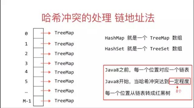 当两个不同的元素,通过哈希函数得到了同一个hashcode,则会产生哈希冲突。HashMap的处理方式是,JDK8之前,每一个位置对应一个链表,链式的存放哈希冲突的元素;JDK8开始,当哈希冲突达到一定程度(8个),每一个位置从链表转换成红黑树。因为红黑树的时间复杂度是O(log n)的,效率优于链表。