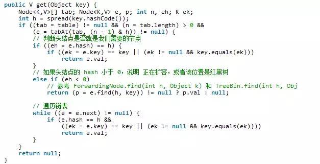 3)如果该位置节点的 hash 值小于 0,说明正在扩容,或者是红黑树,后面调用 find 接口,程序会根据上下文执行具体的方法。