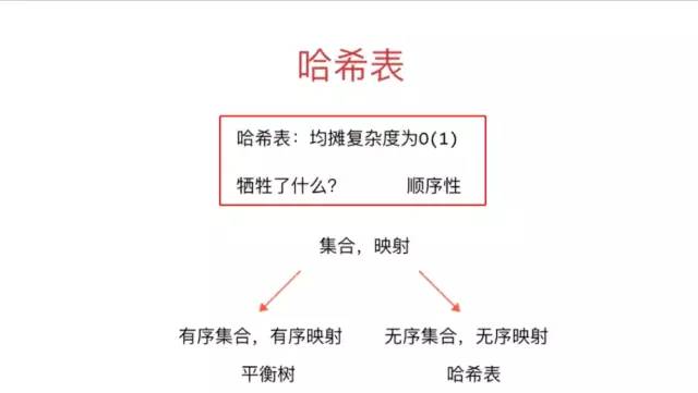 哈希表,均摊复杂度是O(1),因为第一步通过数组索引找到数组位置是O(1),然后到链表中查找元素的均摊复杂度是O(size/length),size为元素个数,length为数组长度。由于Hash表的容量是动态扩容的,也就是说随着size和length成正比的,即size/length是一个常数,于是也是O(1)的复杂度,即总的来说,均摊复杂度是O(1)。但是哈希表是没有顺序性的,即无法对元素进行排序。