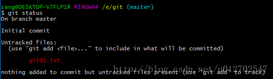 执行结果首先展示了我们当前处于master分支下,然后又说暂时没有东西可以提交,因为当前仓库中还没有记录任何文件的任何状态。此时,我在当前目录下创建一个名为git01.txt的文件,然后再执行git status命令,如下: