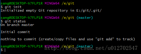 我们可以通过git status命令来查看仓库中文件的状态,比如,在我们仓库刚刚初始化完成之后,我们执行git status命令,执行效果如下: