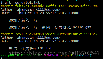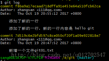 通过git log命令我们可以查看以往仓库中提交的日志,比如提交的版本号、提交者、提交者邮箱、提交时间、提交备注等信息,如下: