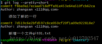 有的时候我们要查看的命令并不用这么详细,可以在git log后面加上--pretty=short,这样显示出来的就只是简略信息了: