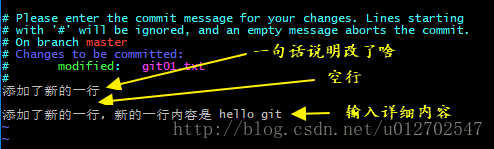如果我们要写的备注非常多,我们可以直接执行git commit命令,此时会自动打开一个vi编辑器,我们直接在编辑器中输入备注信息即可。假设我在git01.txt中随意添加一行内容,然后依次执行git add、git commit命令,此时系统会自动打开一个vi编辑器,如下: