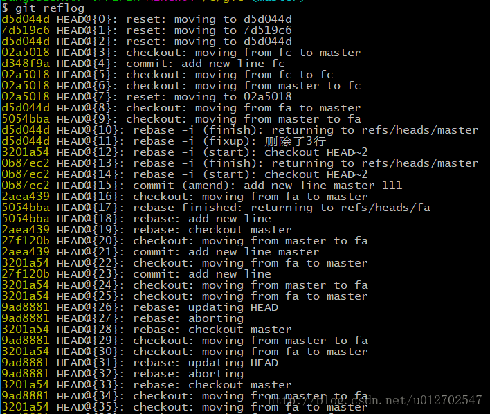 但是git log有一个局限性,就是不能查看已经删除的commit的日志,举个例子:下班了,我发现今天下午提交的代码全都是有问题的,于是做了一个版本回退,回退到今天早上的状态,然后关机回家,第二天来了后我发现搞错了,其实那些代码都是OK的,于是我又想让仓库版本前进到昨天下午的状态,却发现git log命令查看不到昨天下午提交的版本号。此时,我们可以使用git reflog命令来实现这一个请求,git reflog命令可以显示整个本地仓库的commit, 包括所有branch的commit, 甚至包括已经撤销的commit, 只要HEAD发生了变化, 就会在reflog里面看得到,而git log只显示当前分支的commit,并且不显示删除掉的commit。如下图: