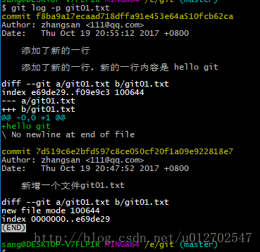 此时显示出来的是我们这个仓库中的所有日志信息,如果我只想查看某一个文件的提交日志,在git log后面加上文件名即可。如下: