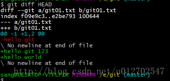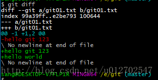 使用git diff命令我们可以查看工作区和暂存区的区别以及工作区和最新提交的差别。我往git01.txt文件中再添加一行hello world,此时执行git diff命令,结果如下: