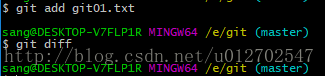 此时这里显示我们新增了一行。此时我们执行git add命令,将文件提交到暂存区,然后再执行git diff,如下: