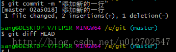 此时没有任何信息输出,因此此时工作区的内容和暂存区的内容已经保持一致了。但是此时工作区和本地仓库中最新提交的内容还是不一致,我们可以通过git diff HEAD命令来查看,如下: